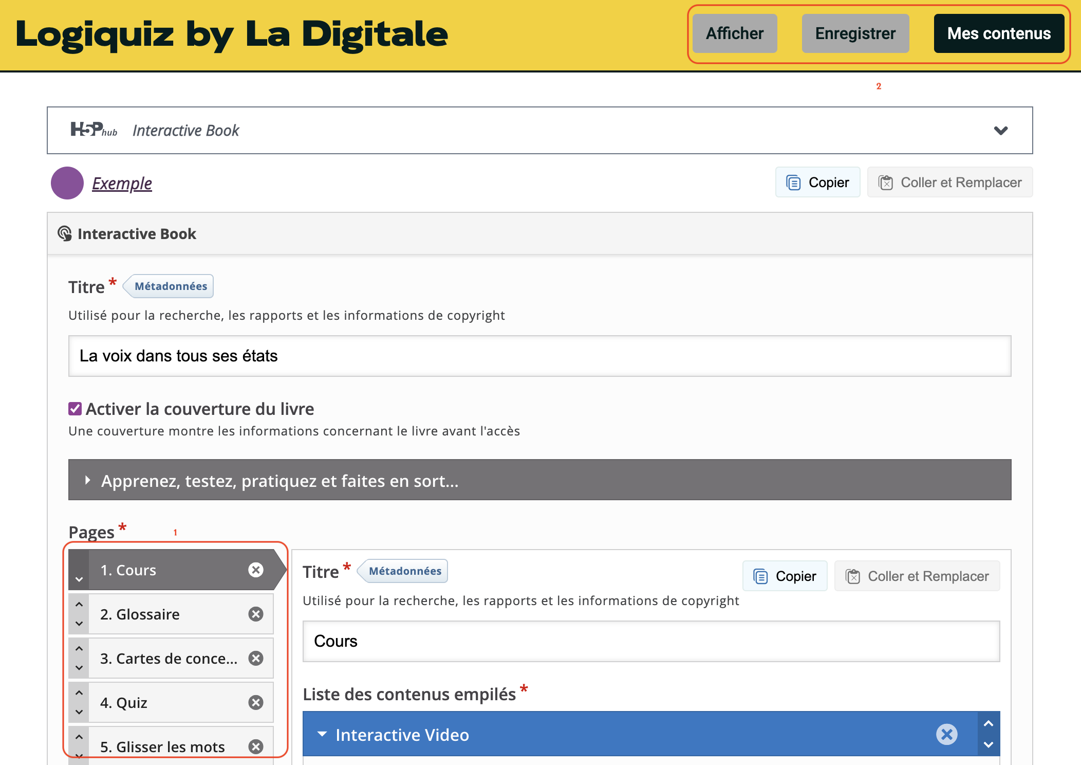 - sélectionner le contenu que vous souhaitez modifier (vidéo interactive, quiz etc.) (cf visuel Fenêtre de contenu)