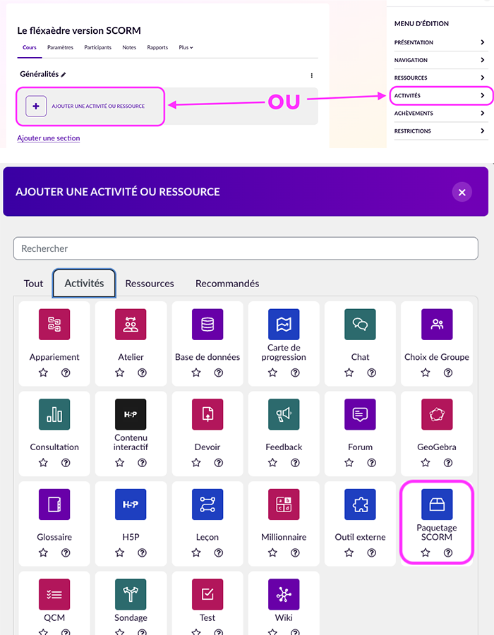 - Ajouter une "Activité" puis sélectionnez "Paquetage SCORM"