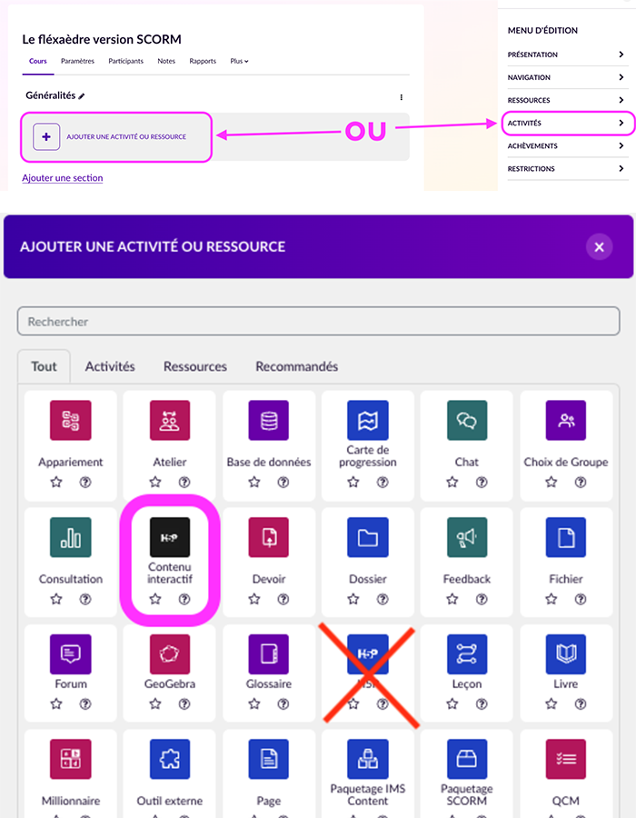- Dans l’onglet "Activités" sélectionnez "Contenu interactif H5P"