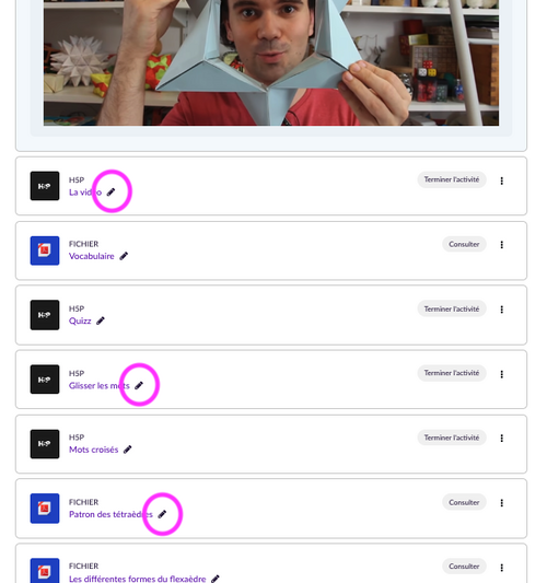 - Vous pouvez modifier le titre de vos ressources et activités en cliquant sur le petit crayon