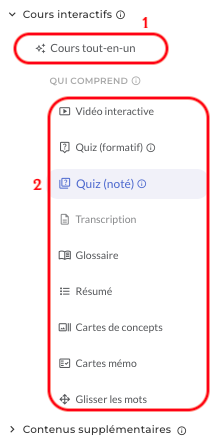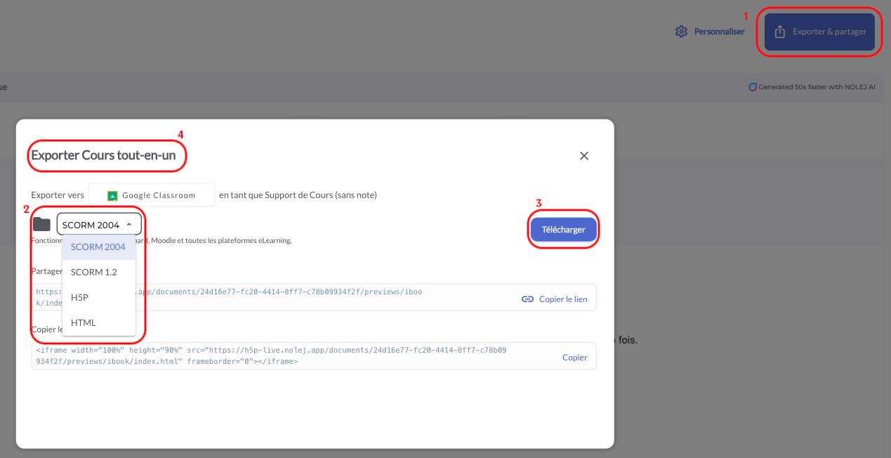 Le format SCORM pour un import sur une plateforme type moodle (Éléa par exemple), le format H5P pour un import par exemple dans l’outil Logiquiz de La digitale, le format HTML pour un import dans un site web ou pour simplement visionner en mode HORS LIGNE votre contenu - en téléchargeant votre cours (cf visuel Fenêtre d’exportation - point N°3)