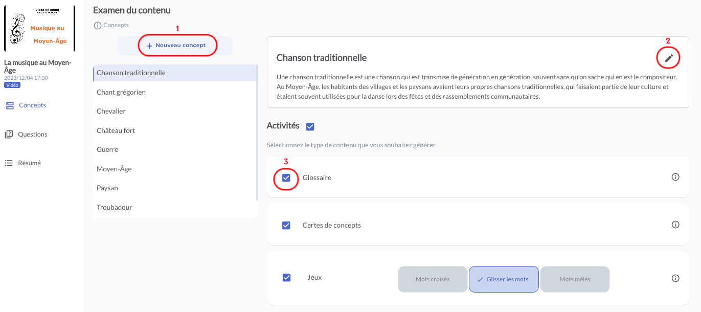 La transcription de votre document source, va mettre en lumière un certain nombre de concepts. Cette liste n’est pas exhaustive car vous pouvez en ajouter de nouveaux (cf visuel Fenêtre des concepts point N°1).