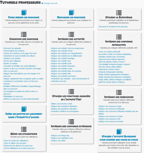 Vous aurez ainsi accès à tous les tutoriels vous permettant d’être guidé dans la conception de votre parcours de e-éducation.