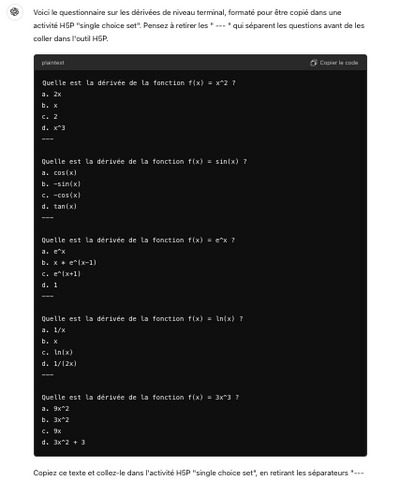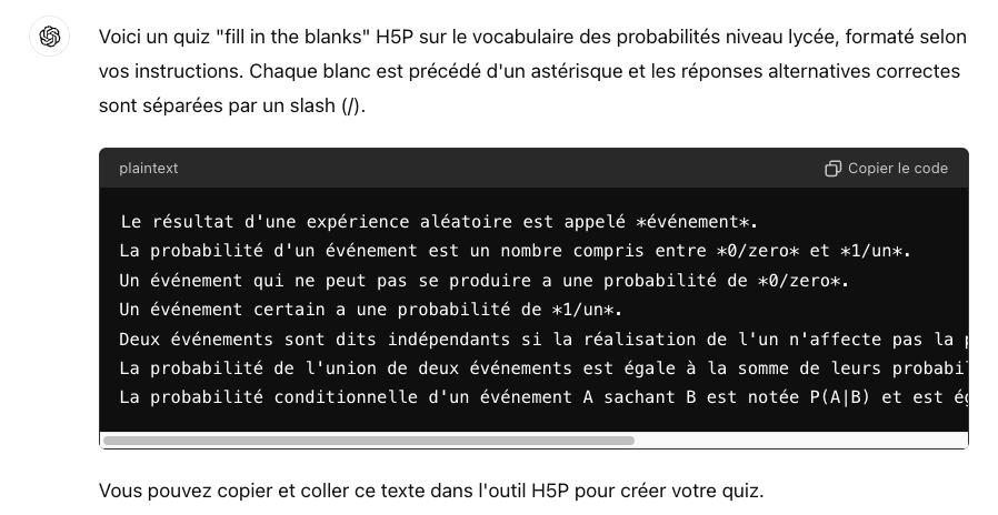 En utilisant un prompt adapté, il est possible de créer du code à copier-coller dans des contenus interactifs H5P.
