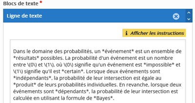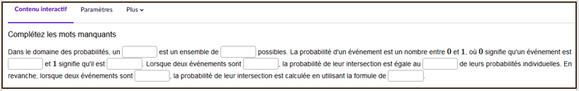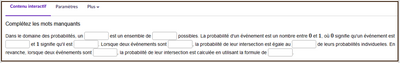 Créer un quiz "Fill in the blanks" H5P à compléter sur le vocabulaire des probabilités niveau lycée. Chaque blanc doit être suivi et précédé d’un seul astérisque.