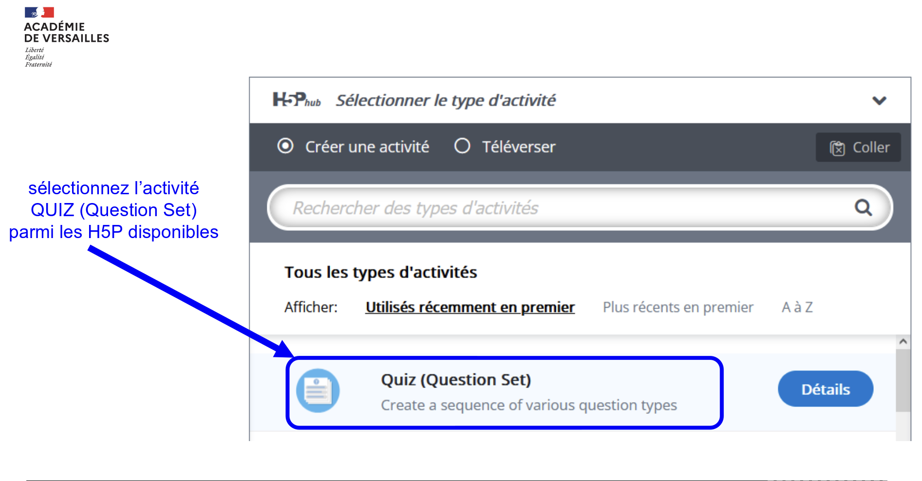 sélectionnez l’activité QUIZ (Question Set) parmi les H5P disponibles