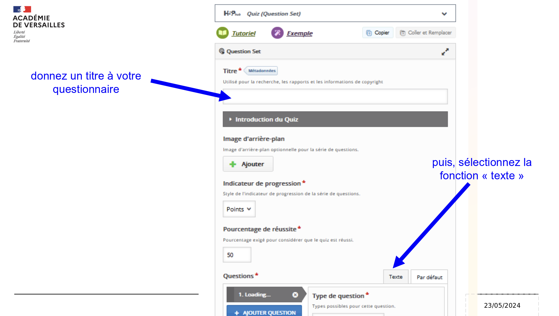 - Compléter les éléments demandés et accéder à l’onglet "texte"