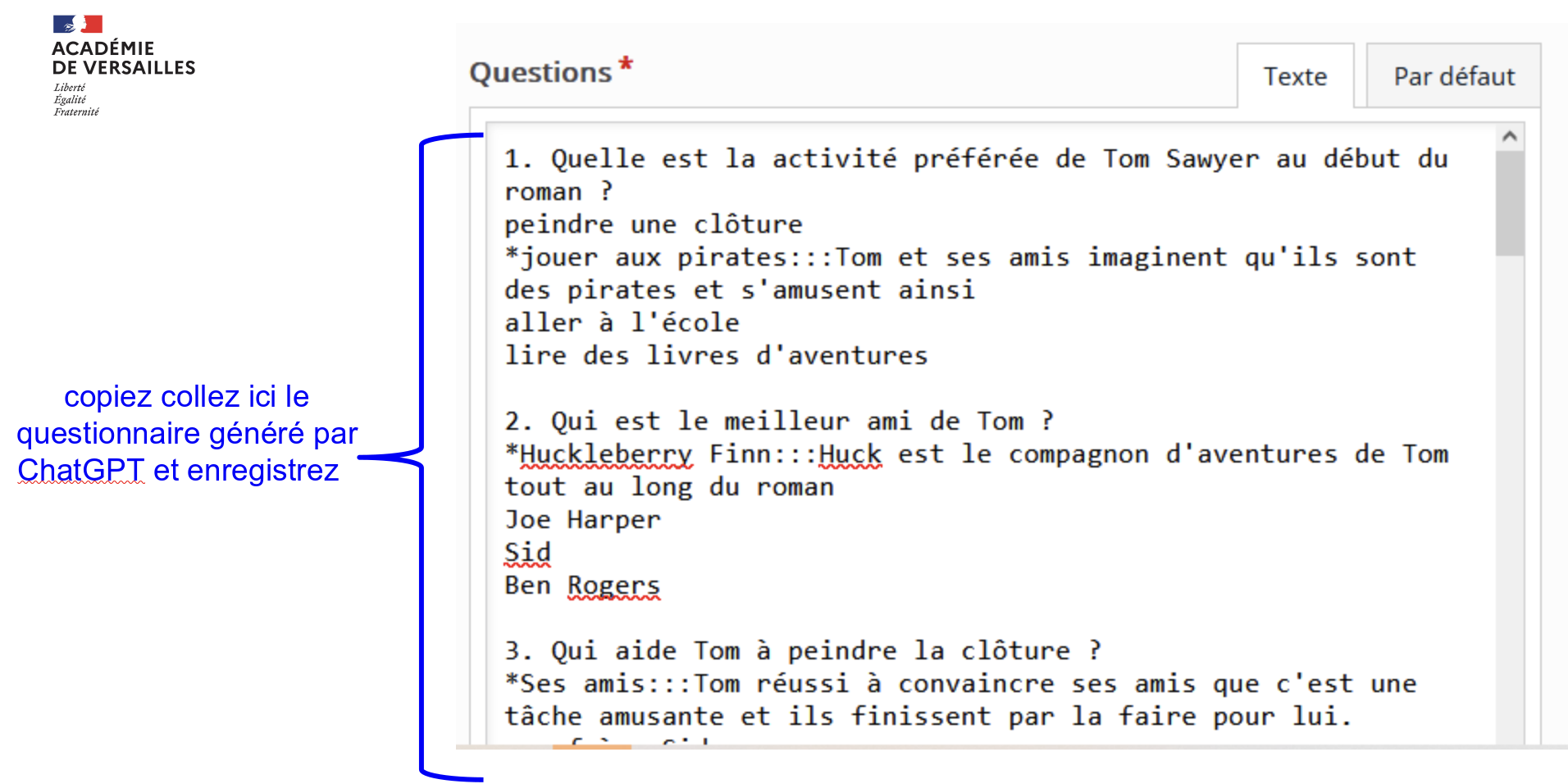 Suis le format décrit à la lettre sans le modifier car je vais copier le résultat dans un outil MOODLE qui prend en compte uniquement que ce format.