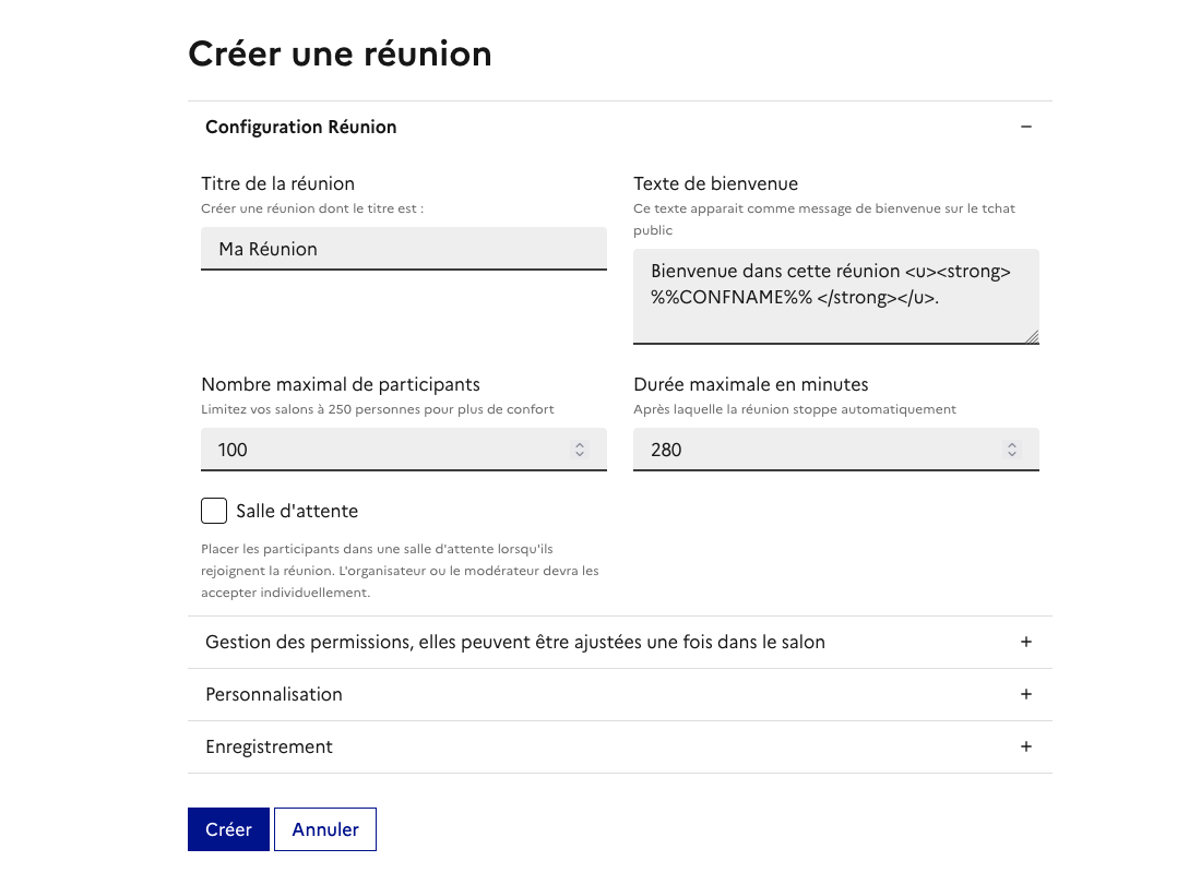 Capture d’écran de la fenêtre de configuration de la réunion : titre, nombre maximum de participants, texte de bienvenue, durée maximum, salle d’attente, gestion des permissions, personnalisation et enregistrement