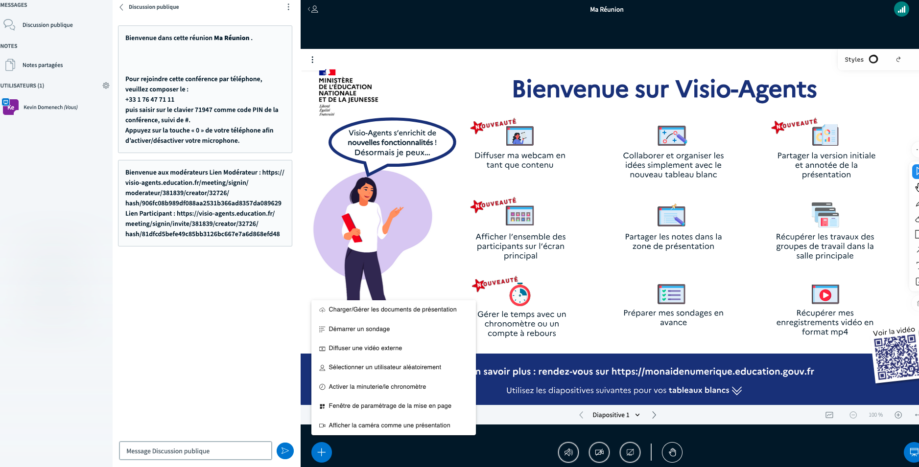 Depuis la barre de tâche inférieure, il sera alors possible de charger des documents, démarrer un sondage, diffuser une vidéo externe, sélectionner un utilisateur aléatoirement, activer le chronomètre, etc.