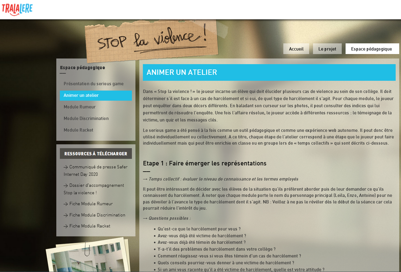 - étape 6 : si l’enquête est résolu, un témoignage de la victime se lance ainsi qu’un quiz et les messages clés.