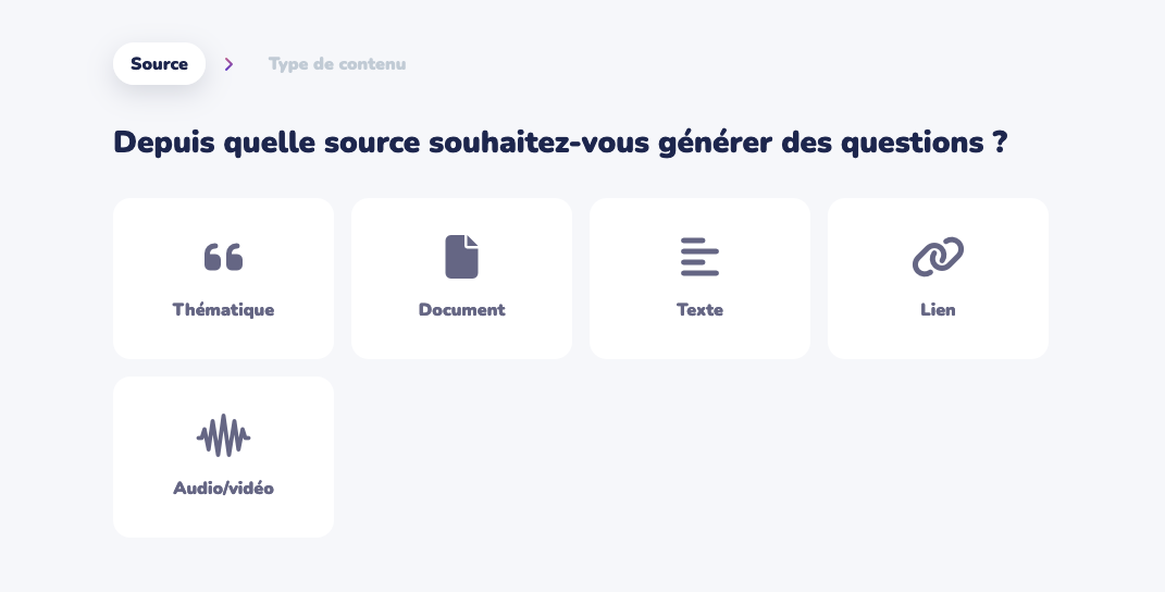 - Choisir le type de document à partir duquel vous souhaitez que les questions soient générées. Vous pouvez le faire à partir de différents formats écrits, mais aussi audio ou à partir d’une vidéo hébergée en ligne.