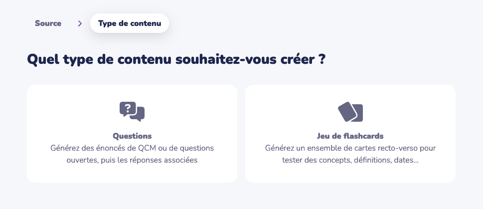 Capture du choix du type de contenu : Questions (QCM, questions ouvertes) ou jeu de flashcards.