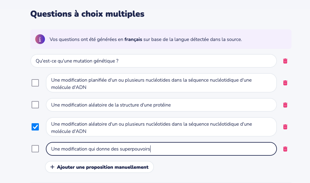 - Les questions proposées peuvent être corrigées si besoin : il peut rester des erreurs ou imprécisions dans les réponses proposées. On peut aussi en ajouter manuellement.