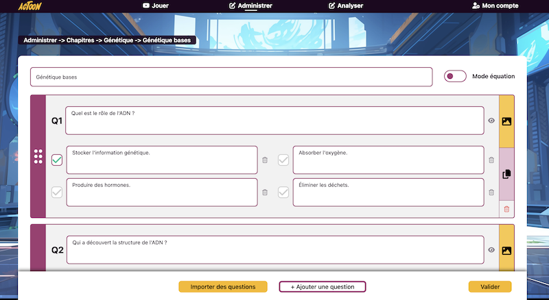 L’enseignant crée le raid en sélectionnant la discipline, le niveau et la thématique. Les questions peuvent être rédigées manuellement, choisies dans la bibliothèque partagée avec d’autres enseignants, ou encore être générées par une IA.