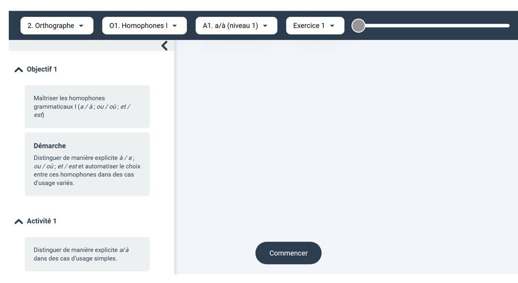 Lors d’une première séance en classe, les élèves passent une évaluation diagnostique sur le module orthographe. L’outil génère ensuite des objectifs personnalisés adaptés aux difficultés de chaque élève. Ils effectuent des exercices pendant le cours lorsqu’ils ont terminé leurs tâches habituelles ou à la maison en tant que devoirs. Toutes les trois semaines, une évaluation sur feuille reprend les objectifs de chaque élève pour mesurer leurs progrès. Cela permet à l’enseignante d’ajuster la remédiation en fonction des besoins spécifiques identifiés.