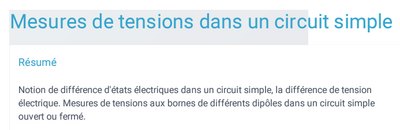 Mesure des tensions dans un circuit simple Résumé : Notion de différence d'états électriques dans un circuit simple, la différence de tension électrique. Mesures de tension aux bornes de différents dipôles dans un circuit simple ouvert ou fermé.
