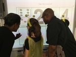 Défis réalisés par les élèves : jeu de dés - TransciptionUne élève tente de résoudre une énigme associée à un jeu de dés affiché sur le mur |