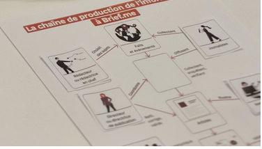 Document schématique présentant les différentes étapes de la production de l’information chez Brief.me, sous forme de chaîne illustrée.