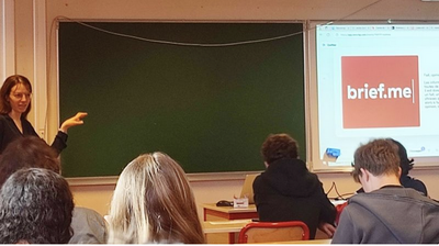 Une intervenante présentant le site d’information Brief.me à une classe d’élèves dans une salle équipée d’un tableau vert et d’un vidéoprojecteur.