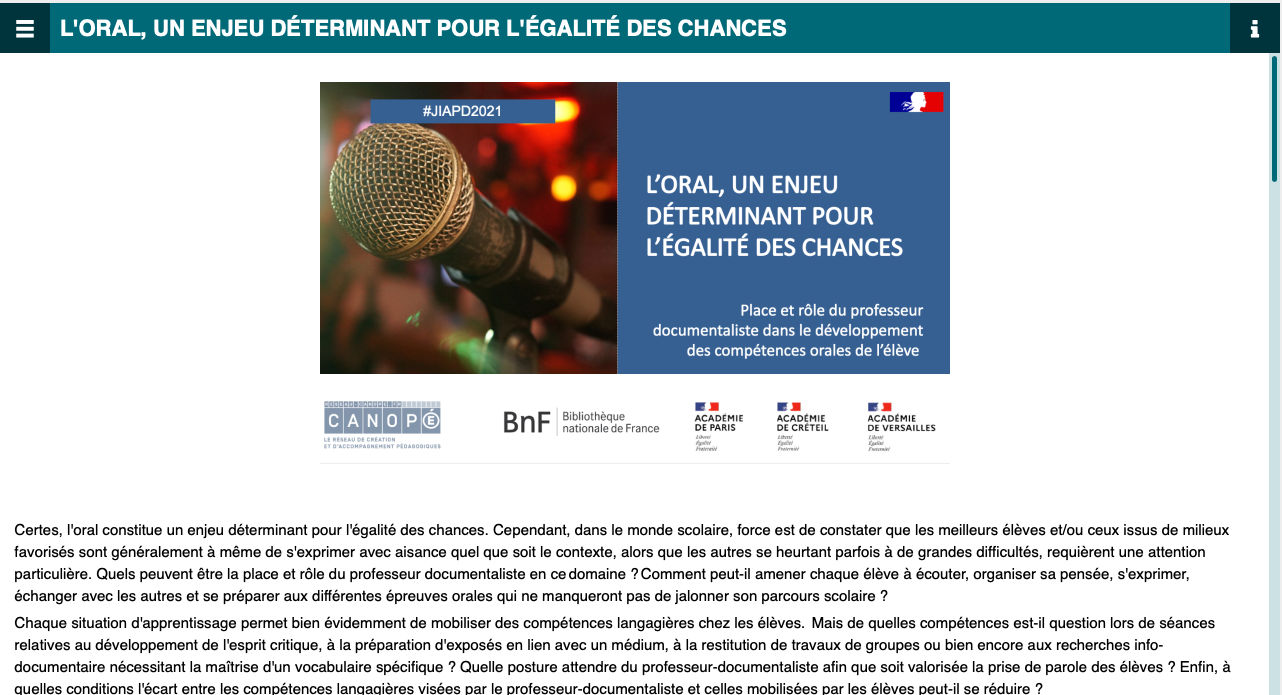 Cette ressource construite avec l’outil CANOPROF a été produite par le réseau canopé IDF pour accompagner un événement régional sur le thème de l’oral à l’école.