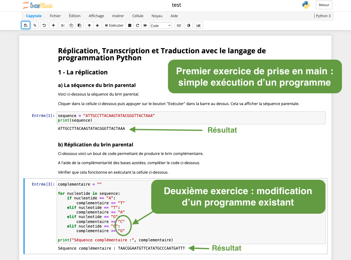 En classe de première spécialité SVT, Capytale et notamment la fonctionnalité Notebook Python est utilisée pour modéliser les mécanismes de réplication, transcription et traduction de l’ADN. L’enseignant, Stanislas Dorey, professeur de SVT, met à disposition des exercices avec du code Python à compléter par les élèves et le programme est directement exécutable.