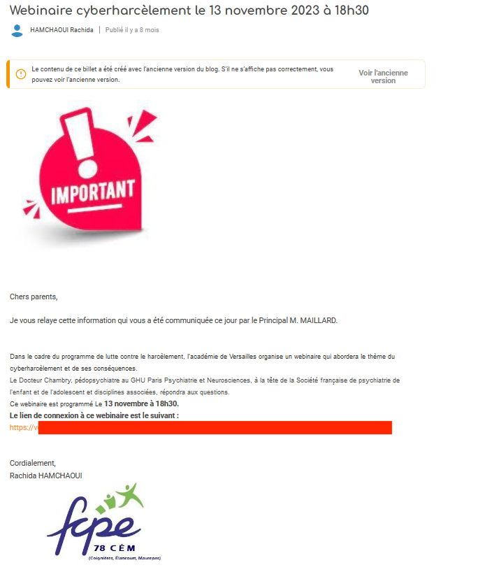 Message d’annonce d’une webconférence à destination des parents d’élèves via un billet de blog