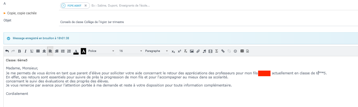 Je me permets de vous écrire en tant que parent d’élève pour solliciter votre aide concernant le retour des appréciations des professeurs pour mon fils [nom masqué], actuellement en classe de 6ème5.