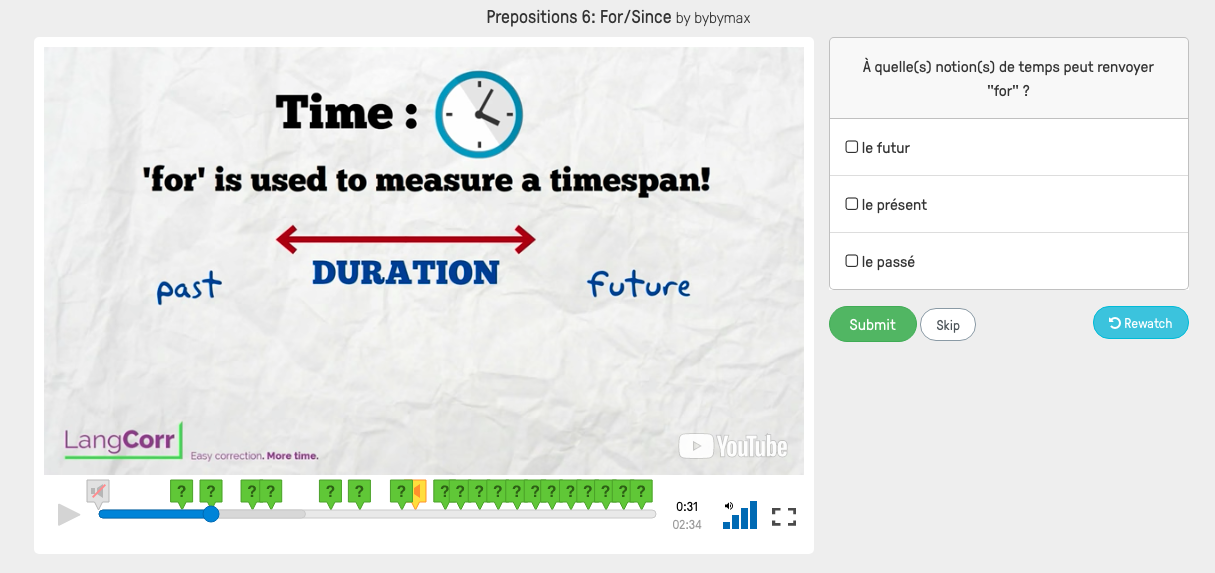 Les élèves doivent répondre à des questions, suivre un commentaire supplémentaire avec votre voix, et l’enseignant peut vérifier si la vidéo est bien lue en intégralité et quelles sont les types de réponses et les types d’erreurs.