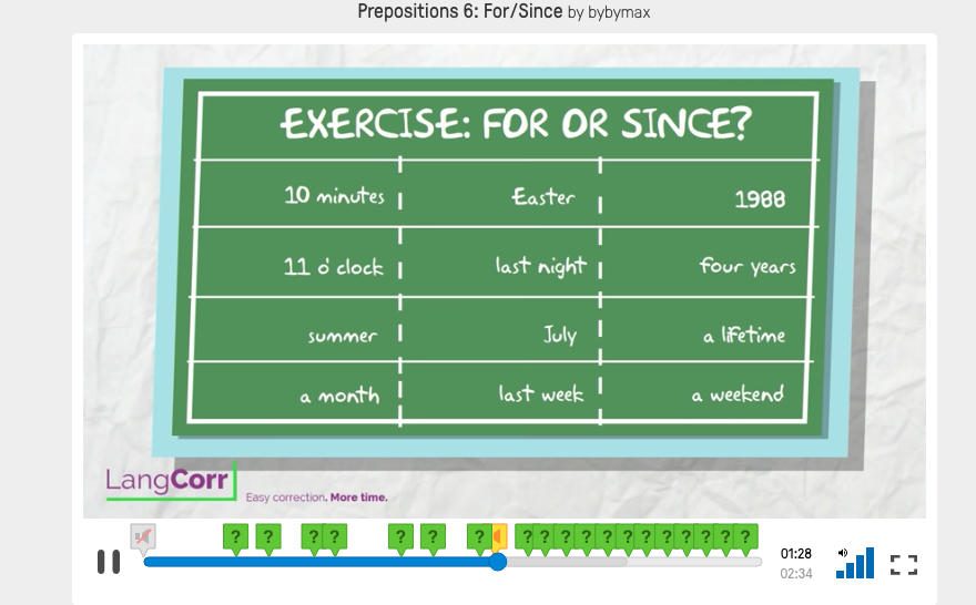 La vidéo est arrêtée sur un visuel d’un tableau intitulé "Exercise : for or since ?". L’augmentation consiste en une consigne audio.