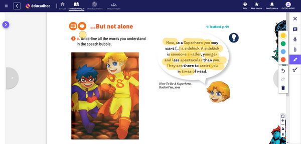 Le manuel est interactif et utilise des supports vidéo et audio notamment ce qui permet à l’élève de travailler sa compréhension orale et de pouvoir mettre sur pause ou de répéter le texte si nécessaire.