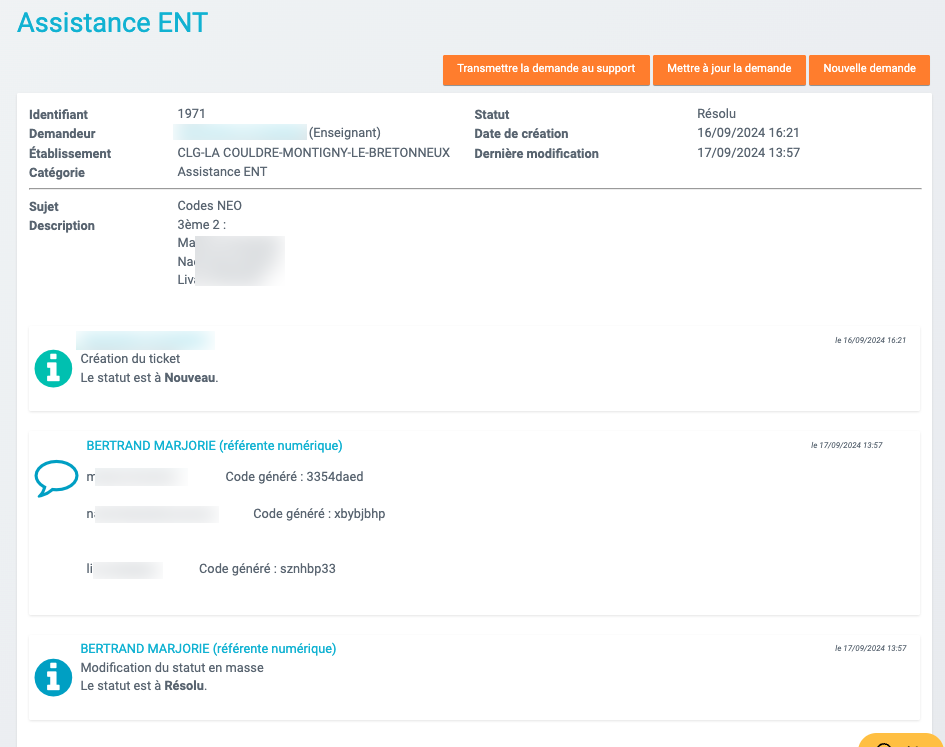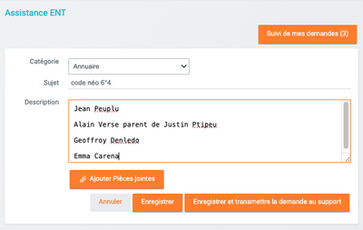 - Toutes les demandes sont conservées ainsi lorsqu’un élève a perdu pour la 356ème fois ses codes, on peut commencer à envisager de lui remonter les bretelles.