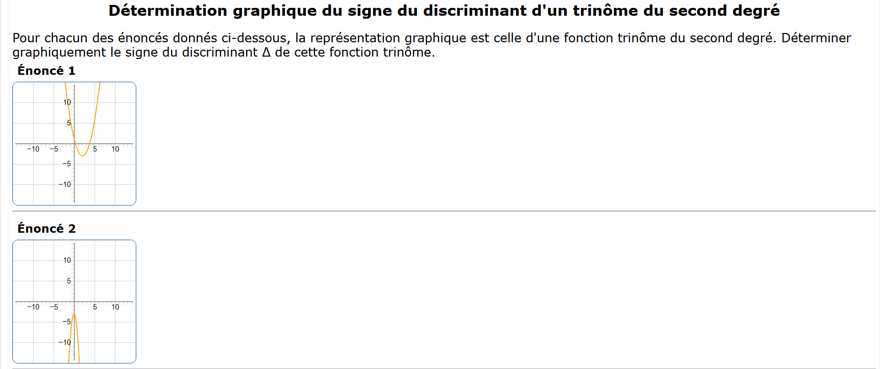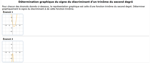 Des fonctions trinômes du second degré sont présentées sous la forme graphique, les élèves doivent déterminer le signe du discriminant.