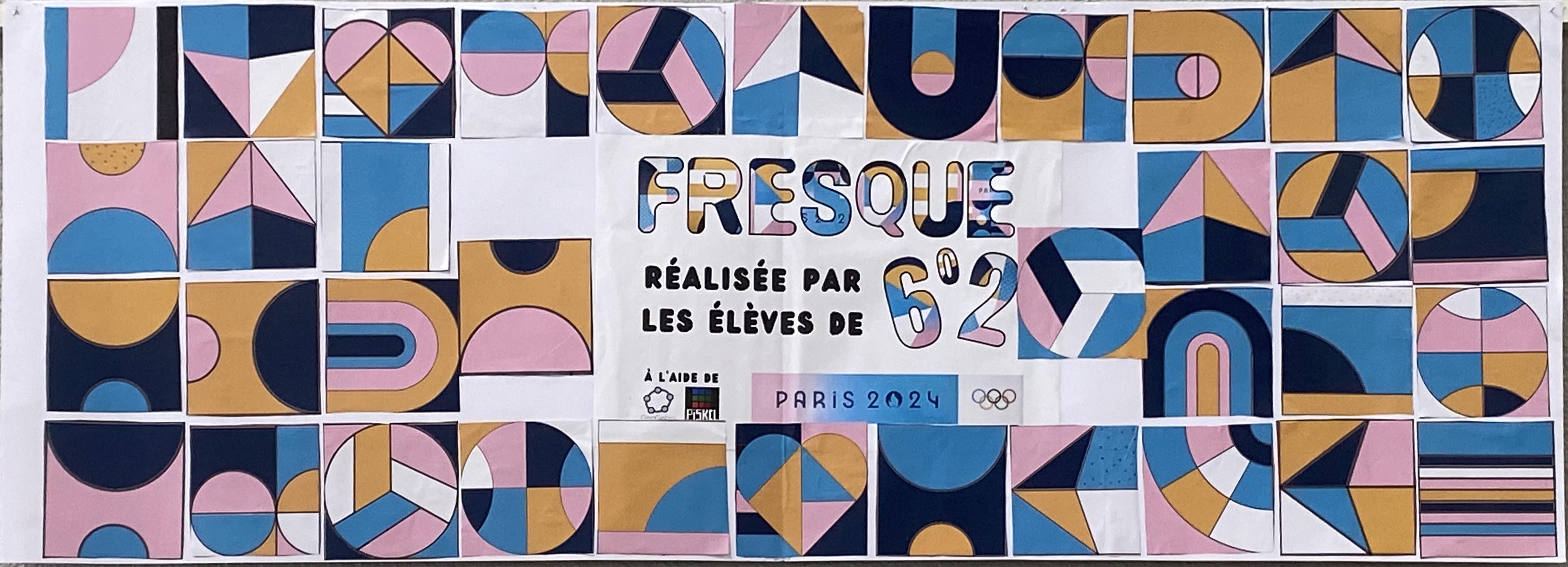 Cette activité est inspirée d’un post de Sophie Desmedt sur le groupe Facebook "Le coin boulot des profs de mathématiques". Cette enseignante de mathématiques a fait tracer puis peindre les formes géométriques sur des plaques en bois pour construire une fresque des Jeux Olympiques et Paralympiques dans son collège.