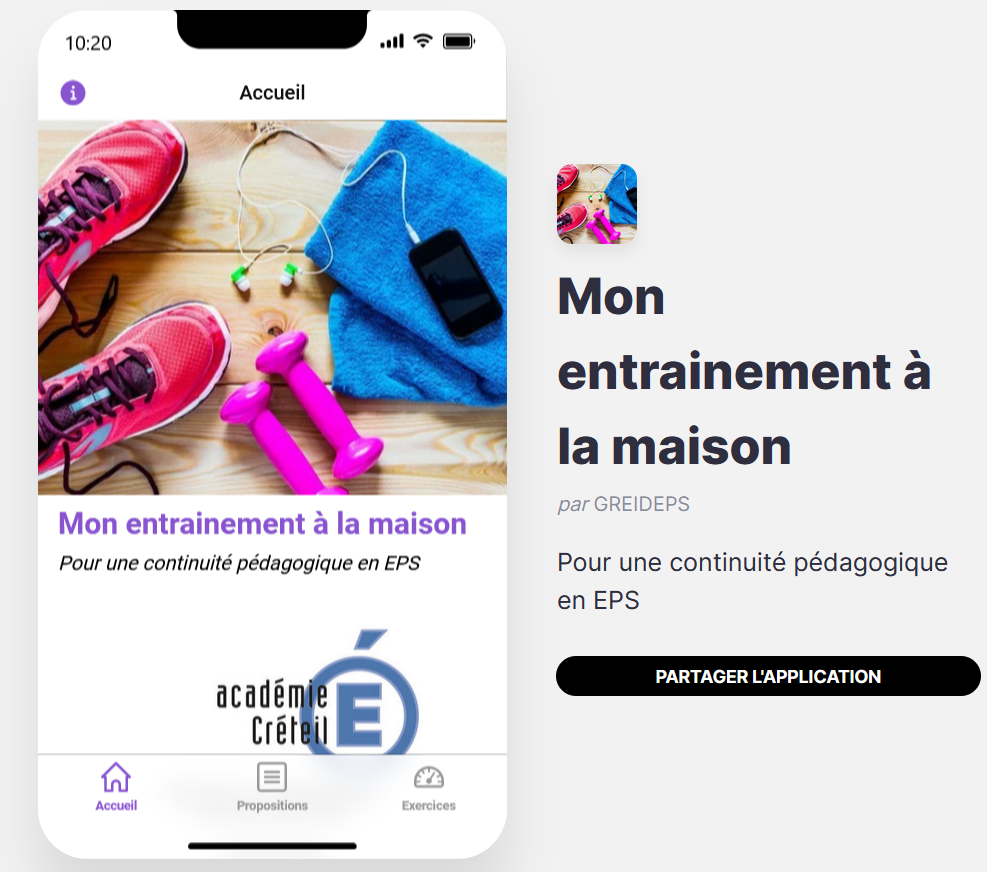 Mon entrainement à la maison est une application réalisée par le GREID EPS dans le cadre de la continuité pédagogique par l’académie de Créteil que vous pouvez consulter en cliquant sur l’image ci-dessous :