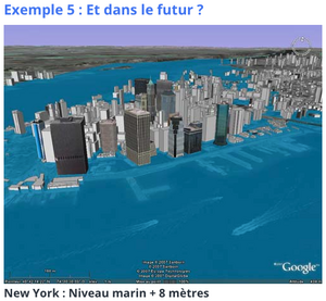 Et dans le futur ? - TransciptionImage Google Earth : Ville de New York lors d’une montée du niveau marin de 8 mètres |
