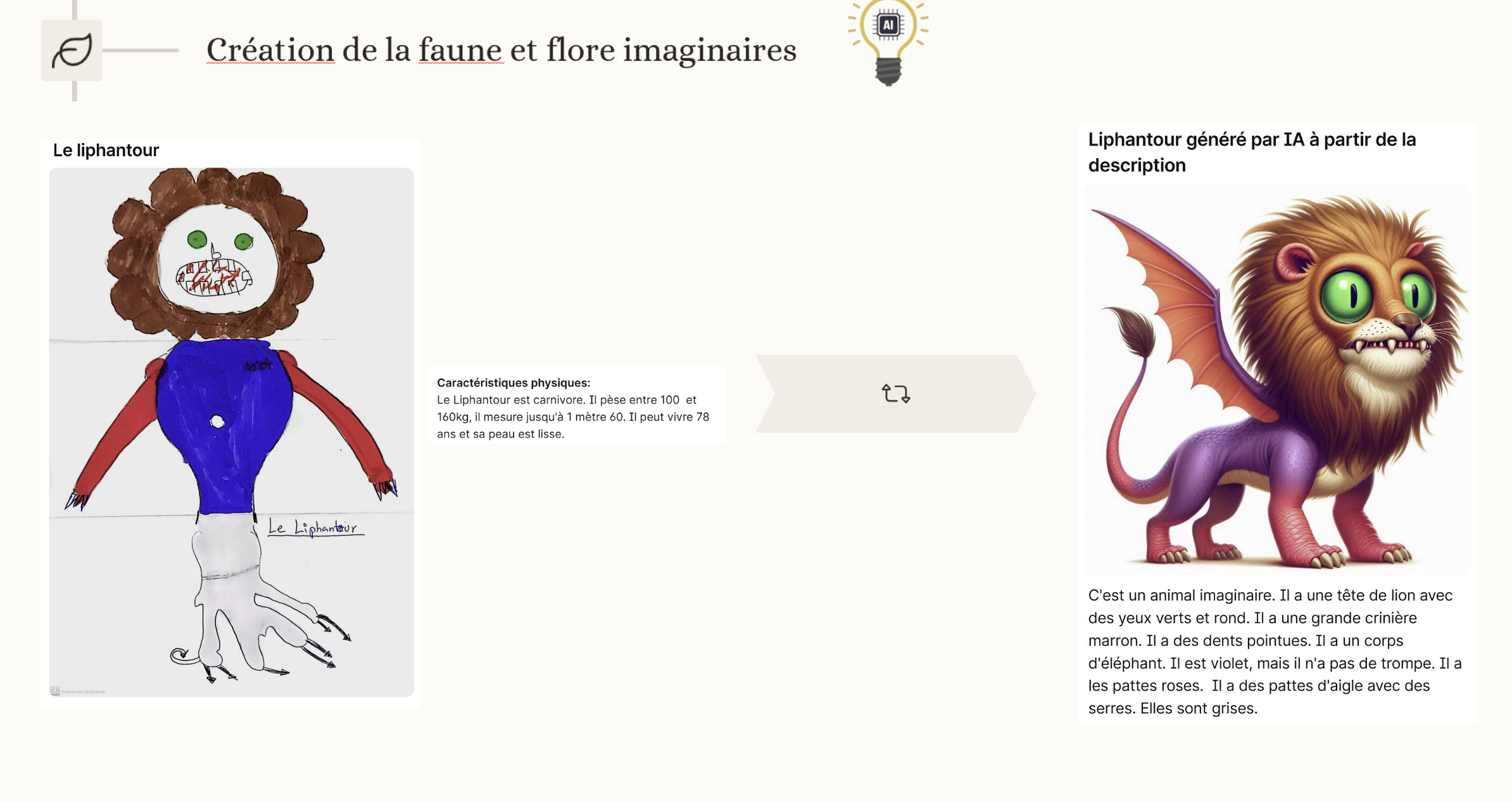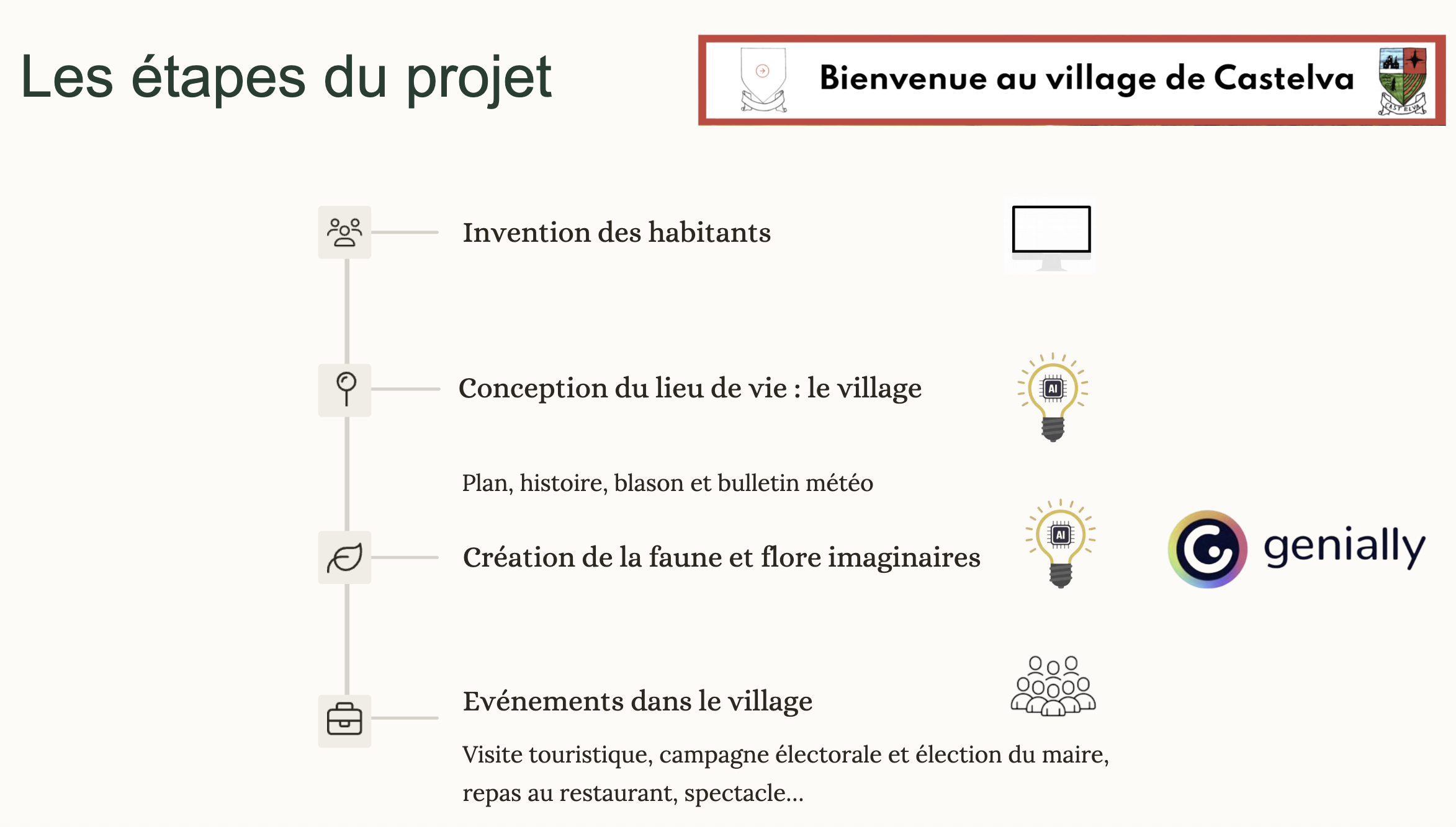 L’IA générative est utilisée ici comme outil d’accompagnement et de valorisation dans une simulation globale, c’est-à-dire une situation d’apprentissage immersive dans laquelle les élèves inventent et animent collectivement un univers fictif (un village imaginaire, des personnages, la faune et la flore...). L’enseignante intègre l’IA à différentes étapes de la séquence :