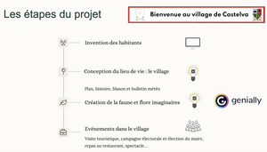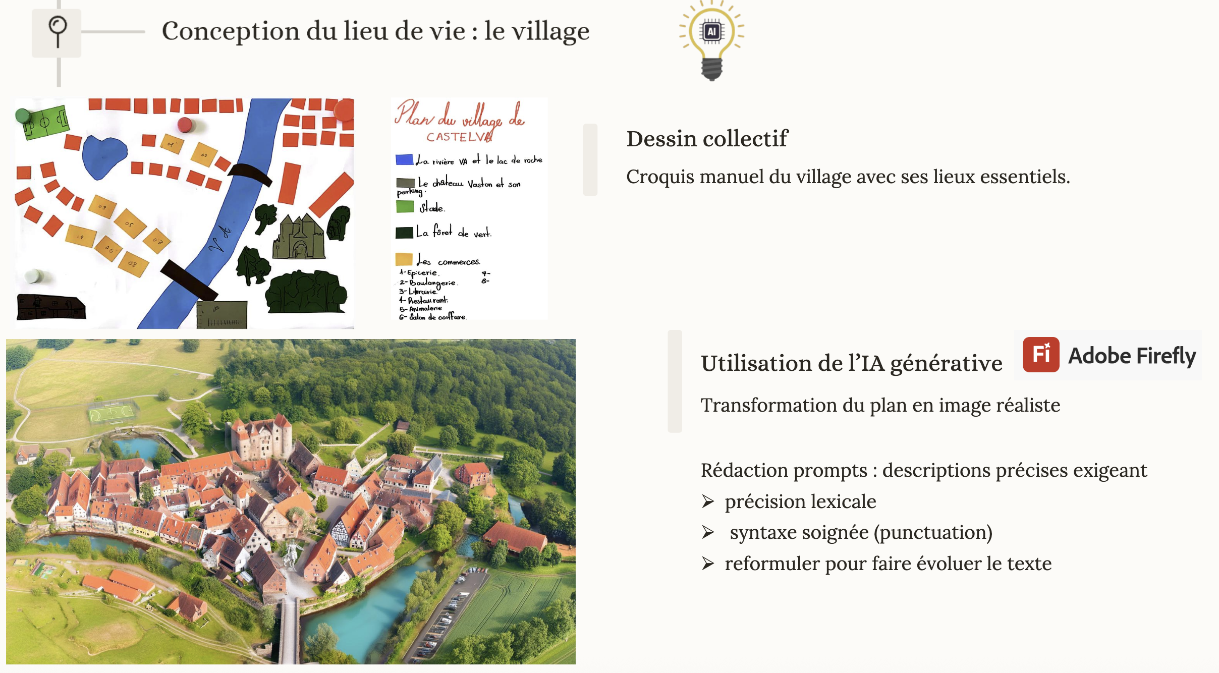 - Invention des habitants et du cadre de vie : les élèves imaginent collectivement un village fictif et ses habitants. Ils définissent les identités, les métiers, les relations et les lieux clés. Un dessin collectif du village est réalisé, représentant les espaces essentiels (mairie, école, marché, parc, etc.).