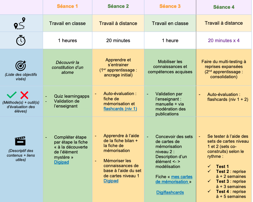 Tableau indiquant Les modalités, la durée, les objectifs et le contenu de 4 séances sur l’atome
