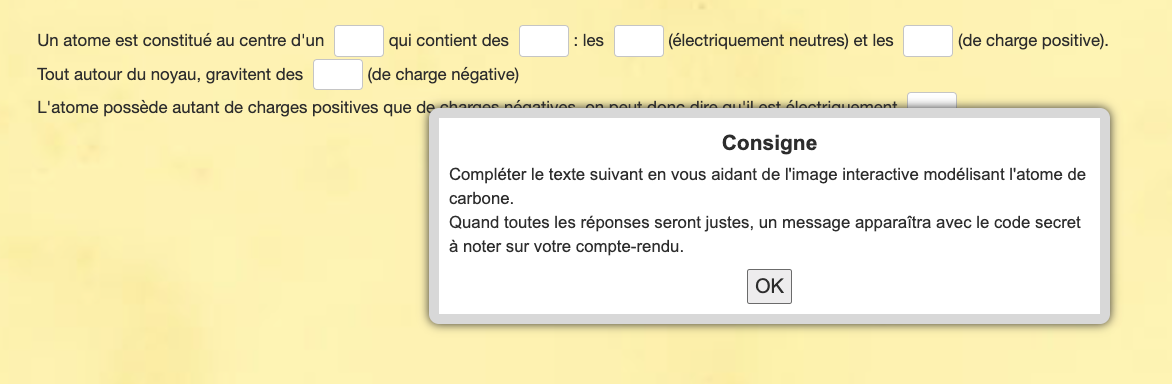 Consigne : Compléter le texte suivant en vous aidant de l’image interactive modélisant l’atome de carbone.
