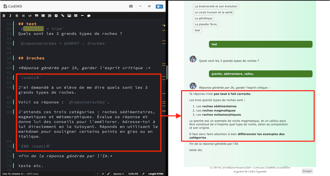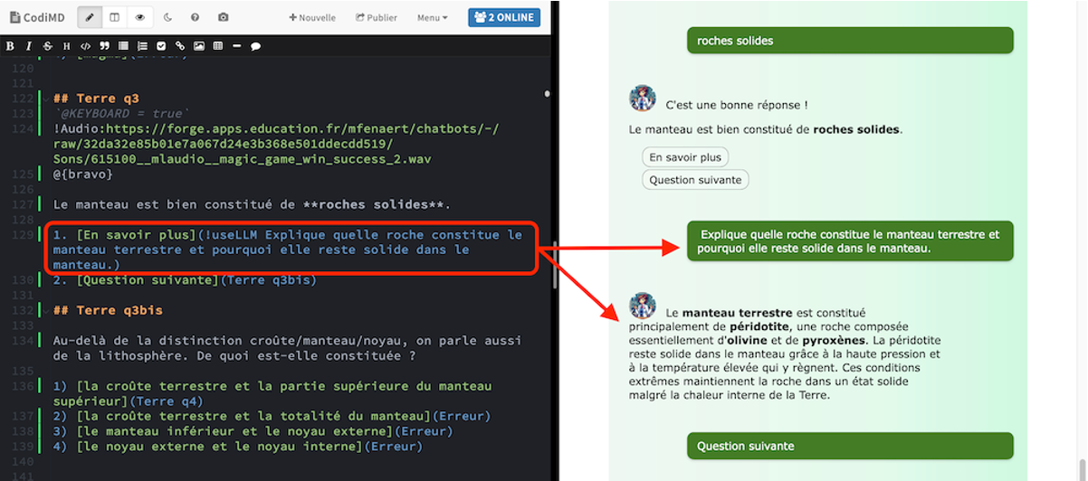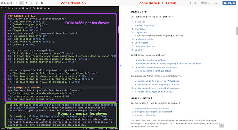 À gauche la zone d’édition avec des QCM et prompts proposés par les élèves en syntaxe Markdown, à droite la zone de visualisation du contenu.