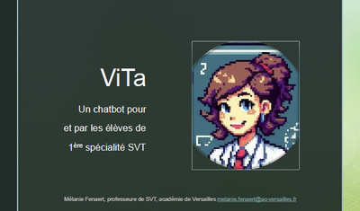 - Retrouvez tous les détails pédagogiques et techniques sur le site SVT Versailles : ViTa : un chatbot avec ou sans IA, créé pour et par les élèves.