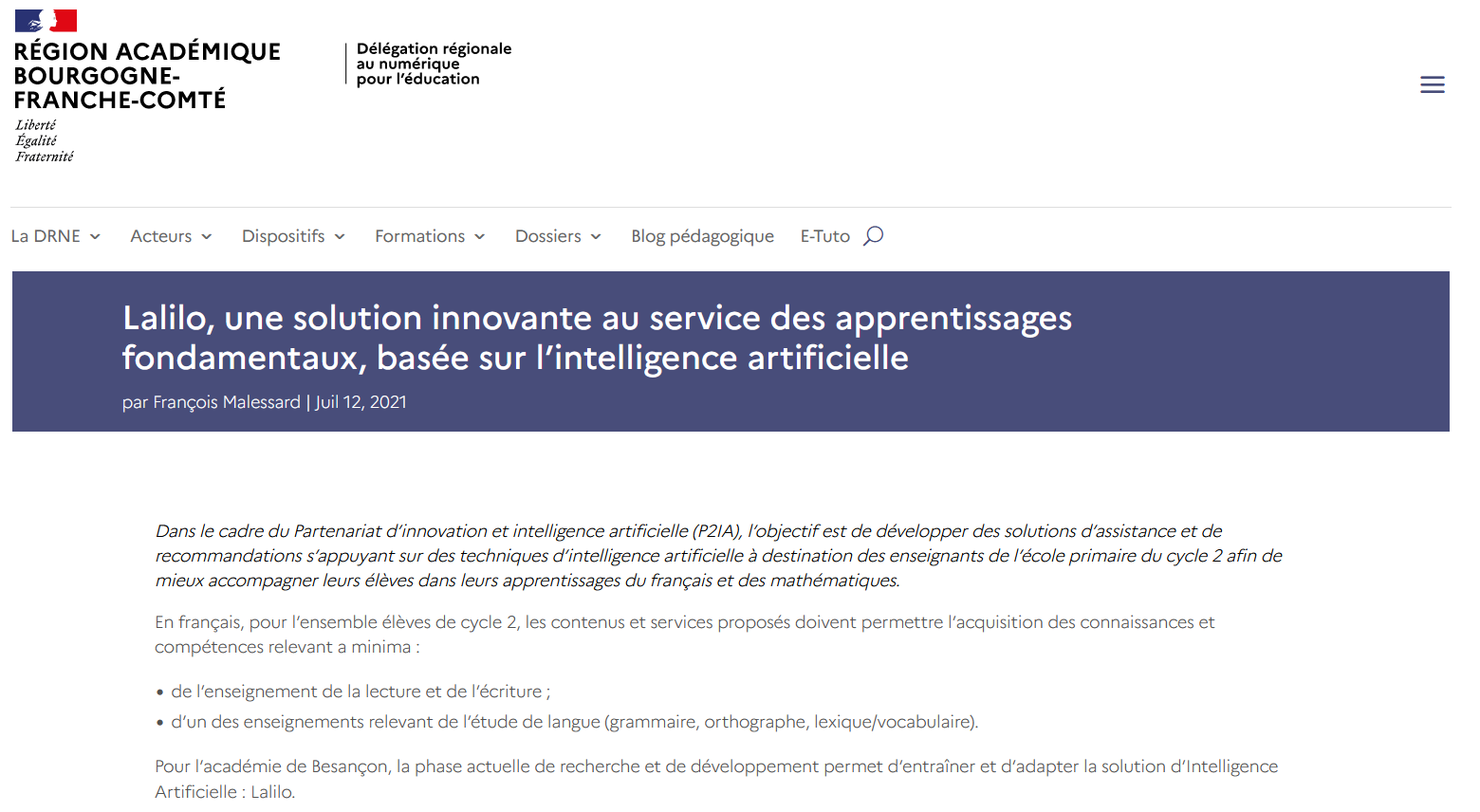 Cinq enseignants du Doubs et quatre enseignants du Jura ont expérimenté cette année Lalilo dans leurs classes. Accompagnés par la Délégation Régionale au Numérique pour l’Éducation (DRNE), ces enseignants ont fait remonter leurs difficultés ainsi que leurs idées d’évolutions afin que la solution progresse et se développe de manière à répondre aux besoins concrets de tout un chacun dans une classe auprès des élèves.
