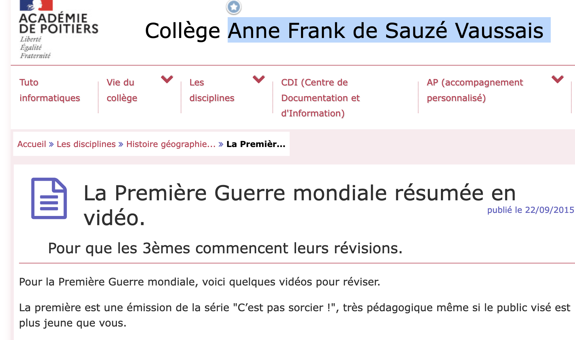 Dans l’Académie de Poitiers, les professeurs d’histoire géographie du collège Anne Frank de Sauzé Vaussais proposent à leurs élèves des ressources en ligne pour commencer les révisions du brevet. Ils ont notamment mis en ligne 2 ressources issues du site lesbonsprofs.com pour aider les élèves à mieux comprendre la première guerre mondiale.