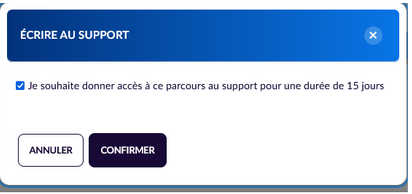 - Vous êtes dans un parcours sur lequel vous avez un rôle formateur. Le bouton support est disponible dans la barre bleue en haut de page, à droite.