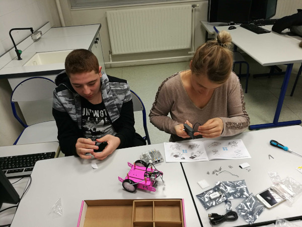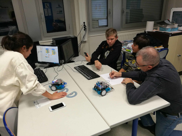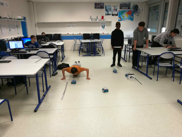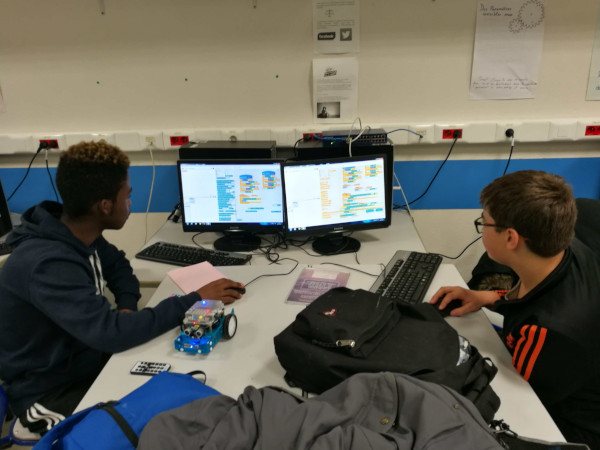 Au mois de juin, sur proposition de M. Chapron, Mme Cossart, la Principale, a pu octroyer 2 heures par semaine pour qu’un groupe d’une dizaine d’élèves volontaires issus de toutes les classes de 3e puissent approfondir leurs connaissances en programmation sur Scratch et faire leurs premiers pas en robotique.