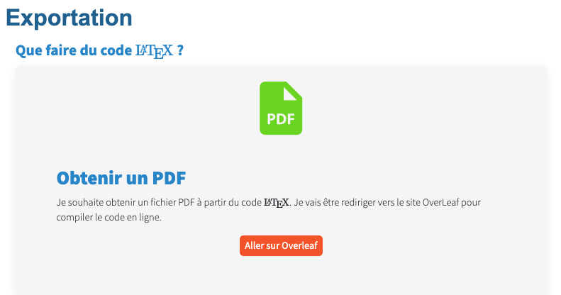 Le sujet peut être téléchargé sous forme de code LateX, vous pouvez alors modifier à votre convenance si vous connaissez ce langage. Sinon, vous pouvez télécharger votre sujet au format pdf. Dans ce cas, MathALÉA vous redirige vers le site OverLeaf pour compiler le code en ligne. Vous pouvez, à la marge, effectuer quelques petites modifications.