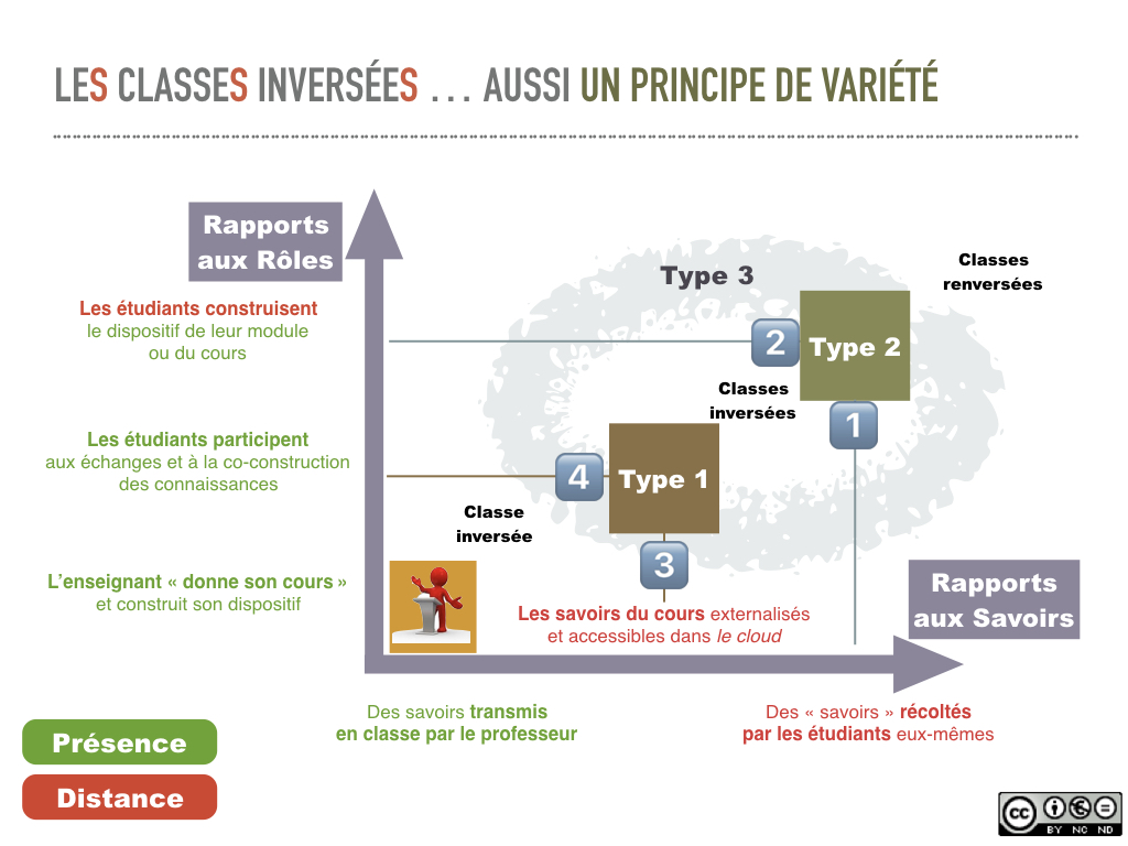 Cette image décrit les différents types de classe inversée proposé par Marcel Lebrun selon deux axes : les rapports aux rôles et aux savoirs.