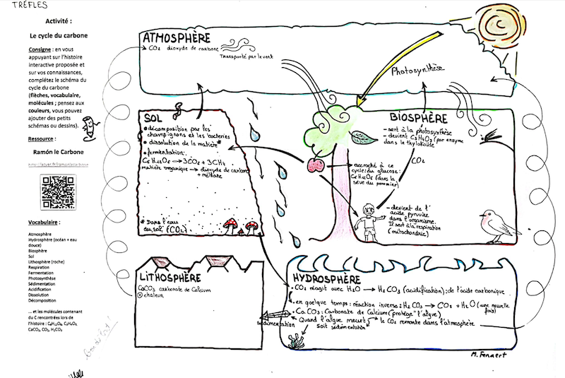 L’image présente la silhouette du cycle du carbone avec ses cinq réservoirs, qu’une équipe d’élèves a complété par des dessins, légendes et flèches afin de reconstituer le trajet de Ramon le carbone.