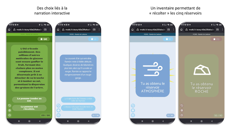 L’image présente 4 captures d’écran de l’histoire interactive lue sur smartphone. On y repère des choix liés à la narration interactive, et des objets récoltés au fil de l’histoire constituant un inventaire (roche, atmosphère).